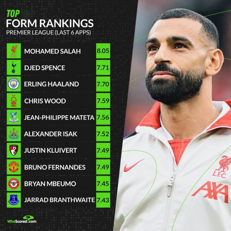 2025-02-26 08:05:12英超近期狀態榜:薩拉赫獨自領跑,斯賓塞、哈蘭德、B費在列