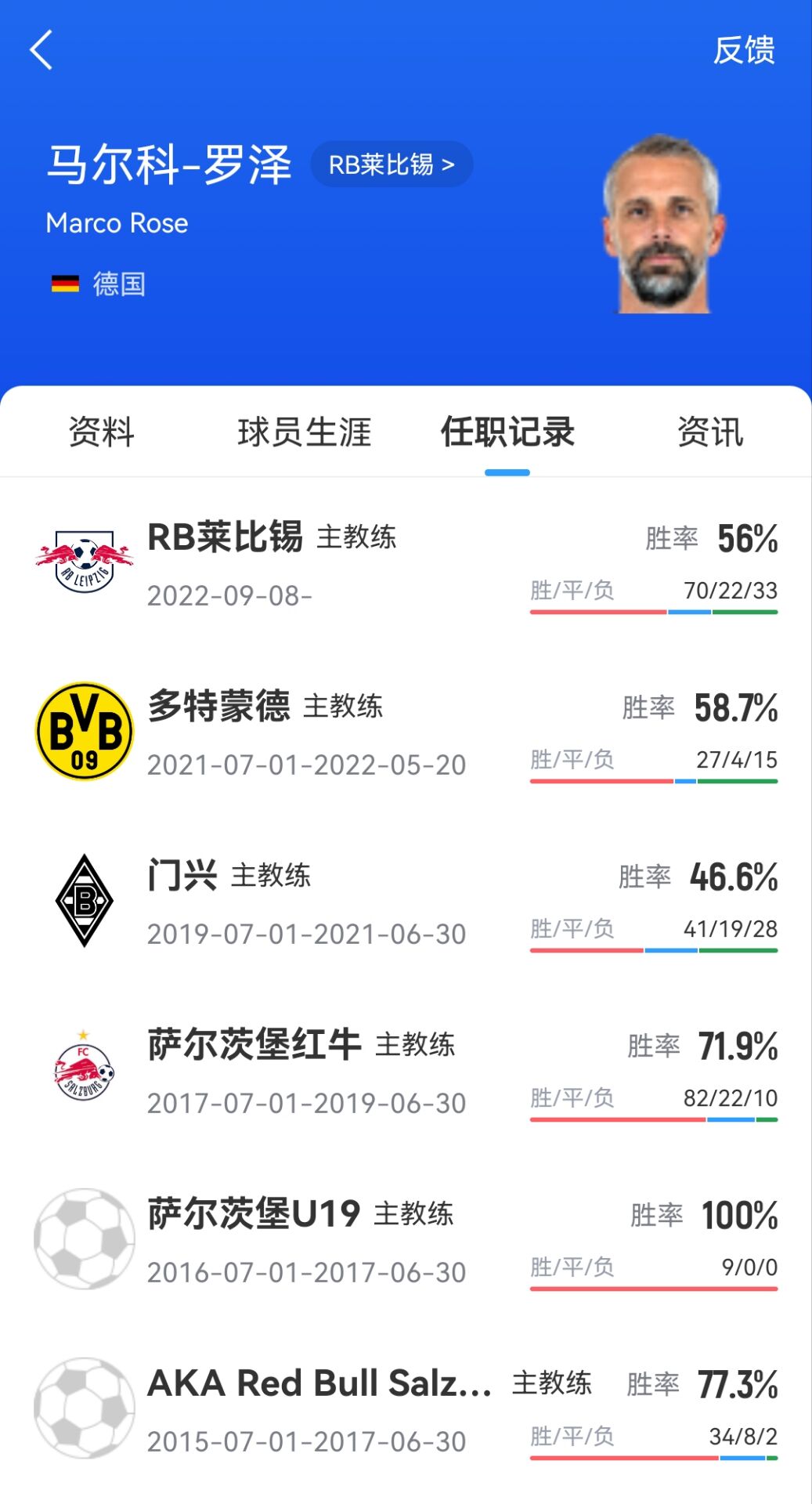 現年48歲的羅澤在2022年9月成為RB萊比錫萊比錫主帥,帶隊戰績127場72勝22平33負。在羅澤執教的第一個賽季,RB萊比錫就拿下了德國杯冠軍,并在2023/24賽季3-0完勝拜仁,拿到了德超杯冠軍。
