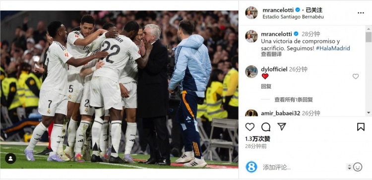 2025-03-30 19:59:44安切洛蒂社媒:這是奉獻和犧牲精神帶來的勝利,我們繼續前進!
