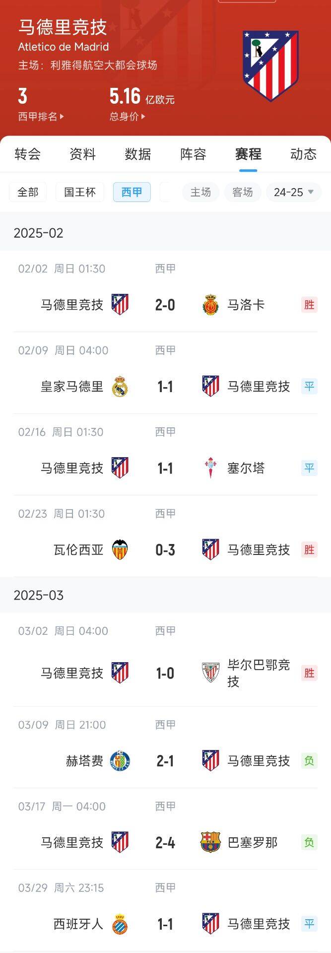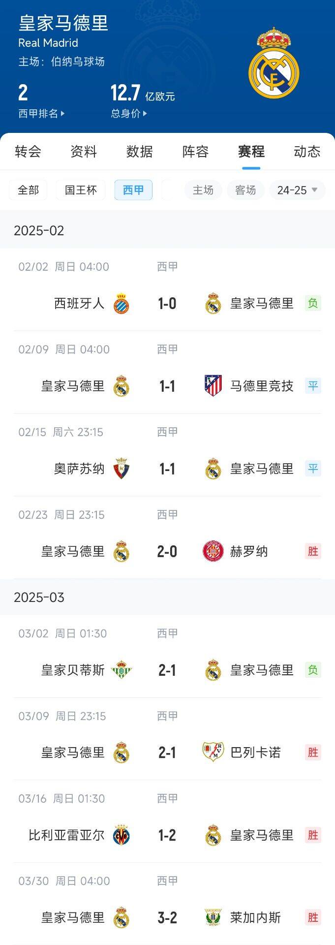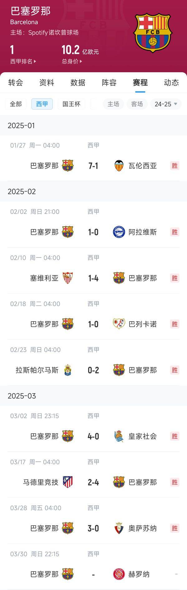 2025-03-30 20:04:15西甲三強(qiáng)狀態(tài)一覽:巴薩8連勝,皇馬8輪4勝近期3連勝,馬競8輪3勝