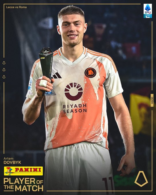 2025-03-30 20:13:20打入制勝進(jìn)球!多夫比克當(dāng)選羅馬1-0萊切一役全場(chǎng)最佳