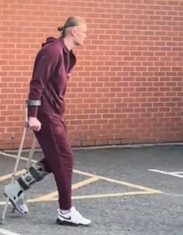 據賽后球迷拍到的畫面,哈蘭德拄拐離開球場,并且腳上穿著保護靴。