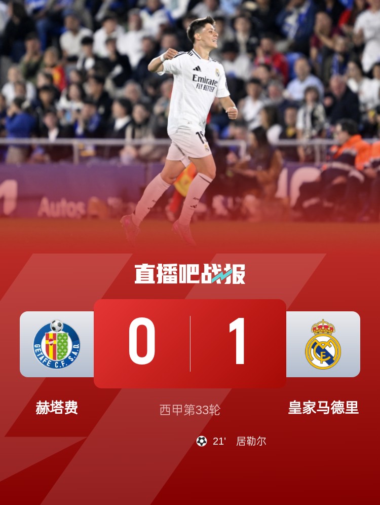 西甲第33輪,皇馬1-0戰勝赫塔費,居勒爾世界波制勝。