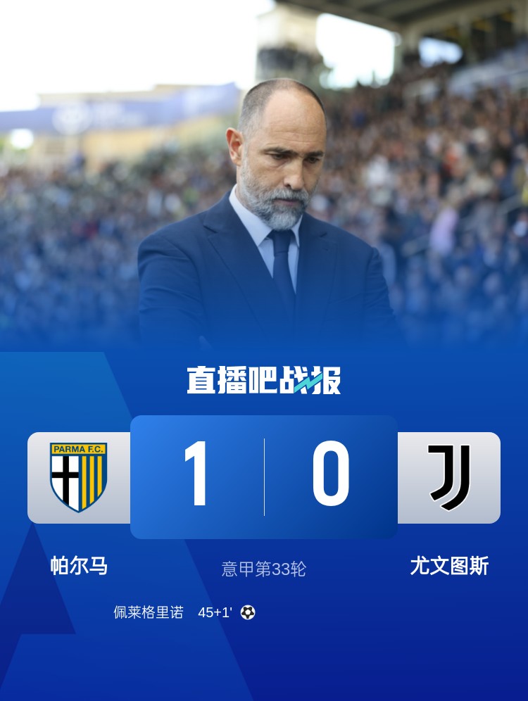 意甲第33輪,帕爾馬1-0戰勝尤文圖斯,佩萊格里諾制勝。