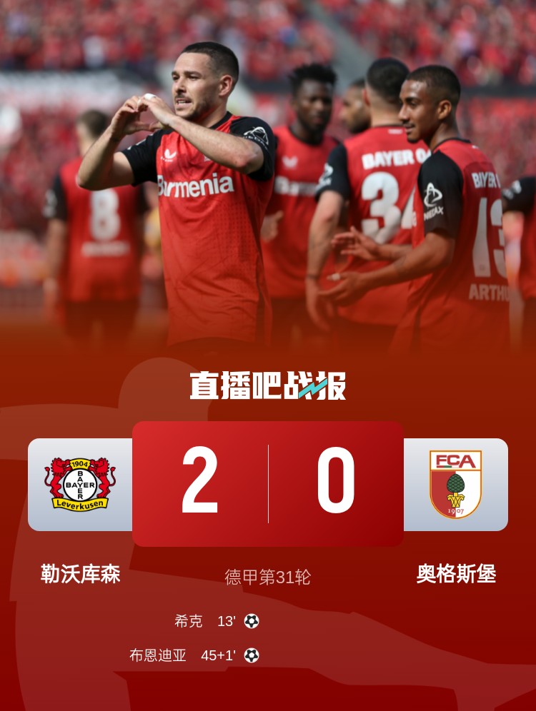 德甲第31輪,勒沃庫森2-0奧格斯堡,剩三輪距榜首8分。上半場,內森泰拉助攻??顺樯涫组_記錄,格里馬爾多抽射造險,布恩迪亞遠射建功;下半場,科瓦日獻精彩撲救。