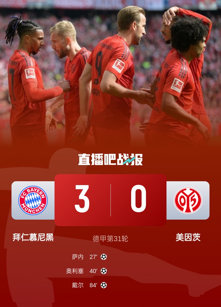 德甲第31輪,拜仁3-0擊敗美因茨,下輪取勝即可奪冠。上半場,薩內屢次制造威脅,并抓住機會右腳低射破門,奧利塞低射建功,凱恩補時染黃下輪將停賽;下半場,薩內兩度中柱,穆勒替補上演德甲500戰里程碑,戴爾頭球破門。