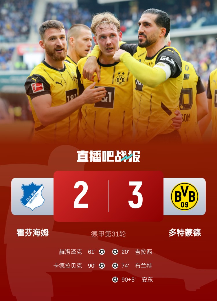 德甲第31輪,多特蒙德3-2霍芬海姆。上半場,斯文松助攻吉拉西破門,吉滕斯造點,吉拉西主罰被撲;下半場,赫洛澤克破門扳平,布蘭特進球,卡德拉貝克頭球扳平,安東補時貢獻絕殺,最后時刻主裁判向霍芬海姆球員連出四張黃牌。
