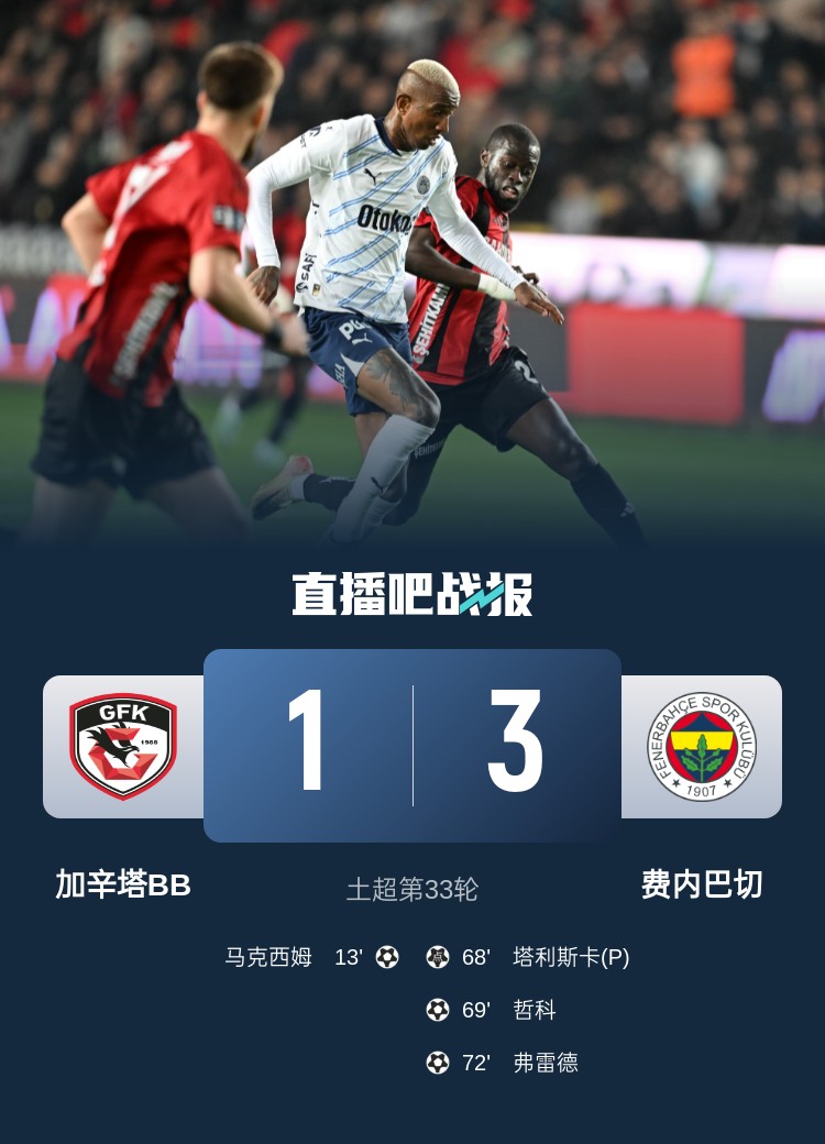 土超第33輪,費內巴切3-1加辛塔BB。上半場,哲科回傳送禮,馬克西姆世界波破門;下半場,塔利斯卡點射,哲科建功,弗雷德鎖定勝局。