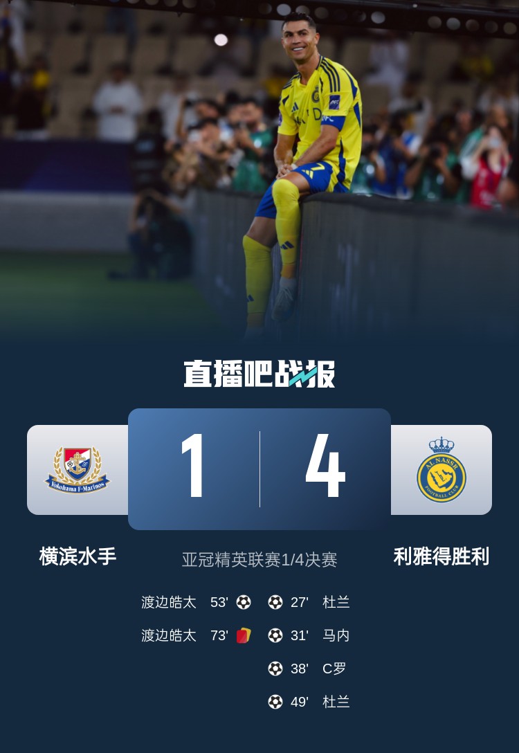 亞冠精英聯賽1/4決賽,利雅得勝利4-1淘汰橫濱水手,晉級亞冠精英四強。上半場,杜蘭首開記錄,橫濱后衛托馬斯-登解圍失誤送禮,馬內擴大比分,C羅斬獲生涯第934球;下半場,杜蘭完成雙響,渡邊皓太扳回一城+染紅。