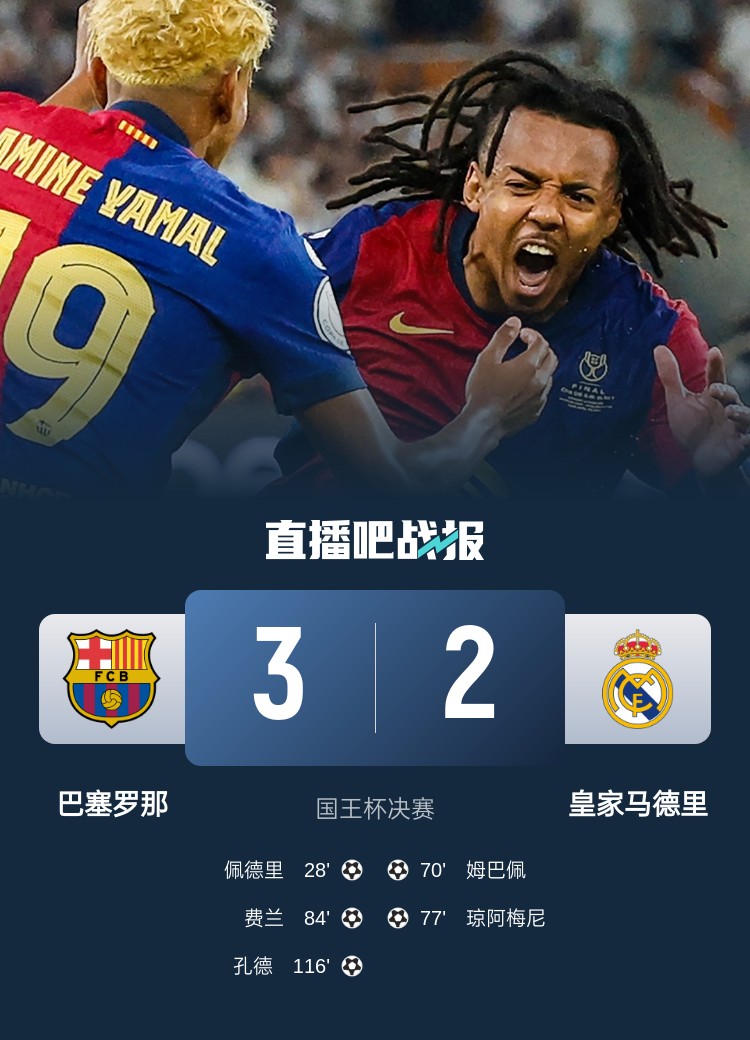 國王杯決賽,巴薩3-2皇馬奪隊史第32座國王杯。上半場,門迪傷退,佩德里破門,維尼修斯造點被取消;下半場,姆巴佩定位球直接破門,瓊阿梅尼頭槌反超,庫爾圖瓦出擊失誤送費蘭空門,VAR取消巴薩讀秒點球改判假摔;加時賽,孔德第116分鐘遠射制勝。