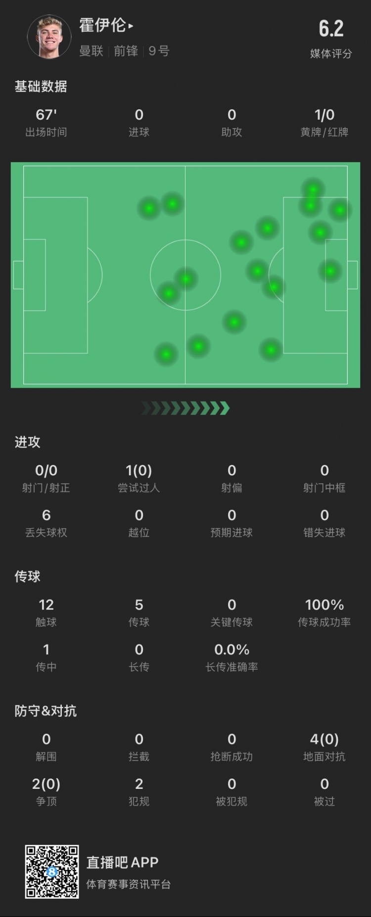 2025-02-27 08:03:51霍伊倫本場:射門關鍵傳球等數據掛零,6次對抗0成功,僅觸球12次