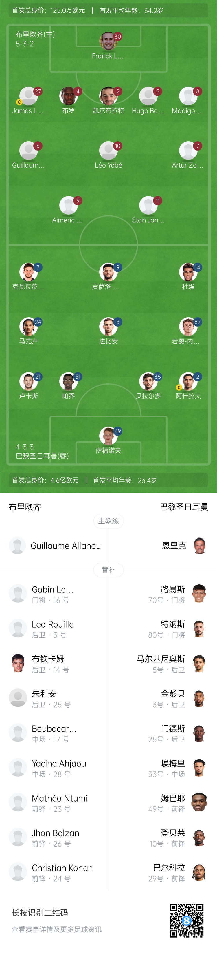 布里歐齊首發:30-弗蘭克、27-詹姆斯、4-布羅、2-凱爾布拉特、5-雨果、8-馬迪貢、6-吉約姆、10-約貝、7-阿圖爾、9-埃梅里克、11-亞諾