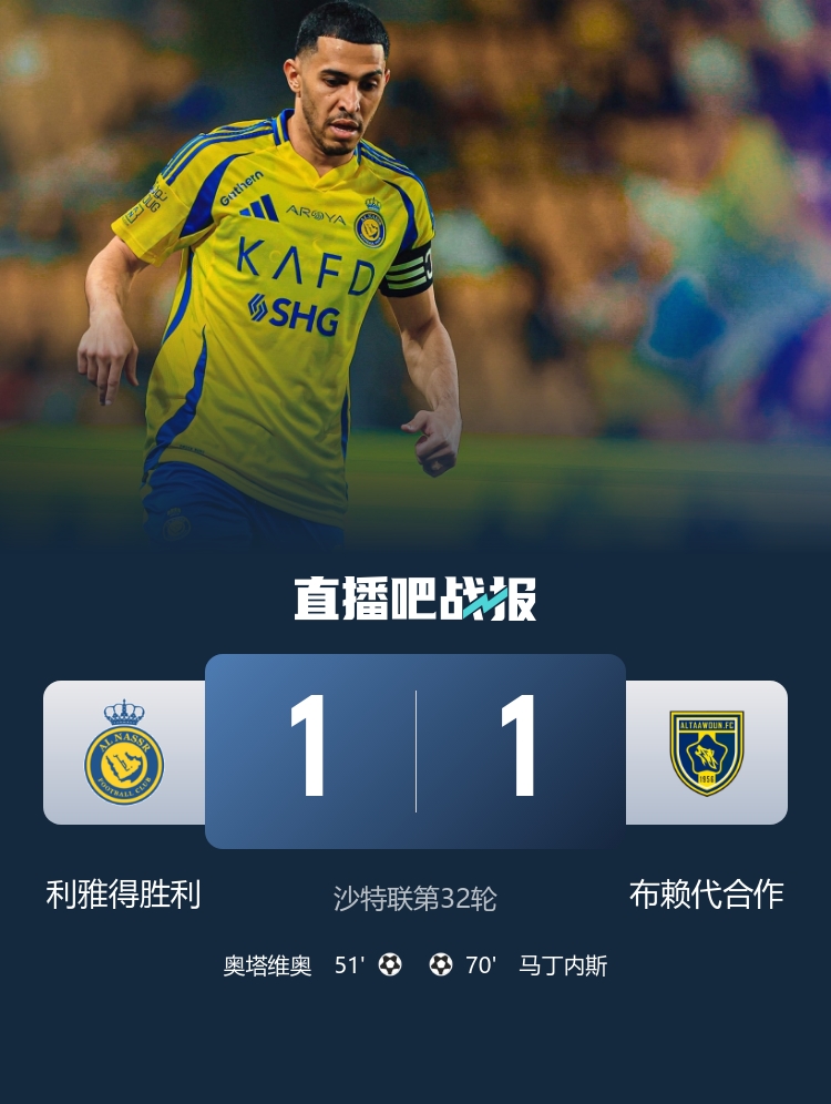 利雅得勝利1-1戰平布賴代合作,還剩2輪的情況下落后新月7分,無緣下賽季亞冠精英聯賽。