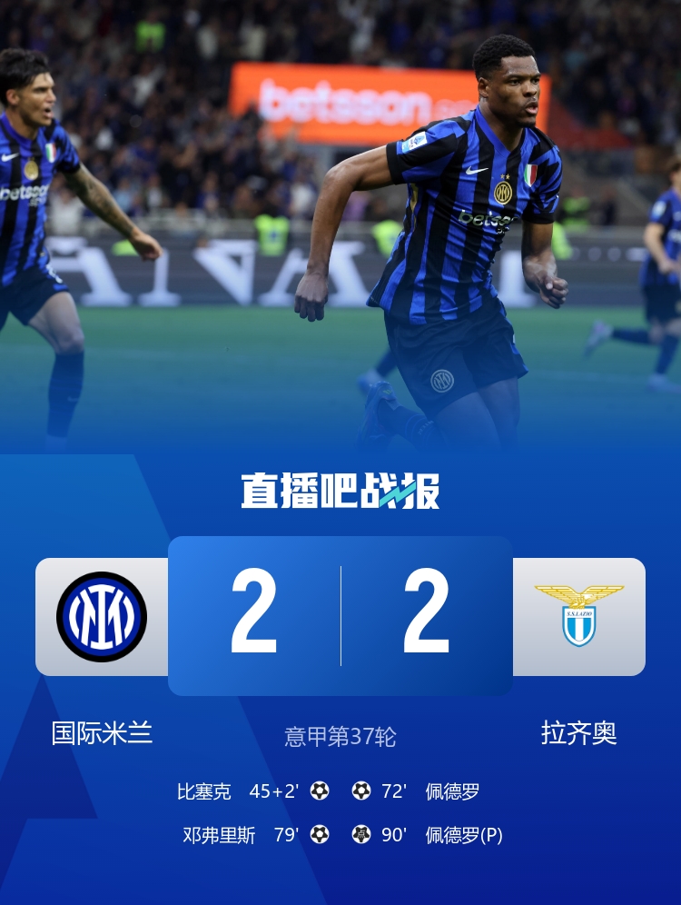 意甲聯(lián)賽第37輪,國(guó)米2-2遭拉齊奧絕平,佩德羅梅開(kāi)二度,比塞克進(jìn)球+送點(diǎn)。