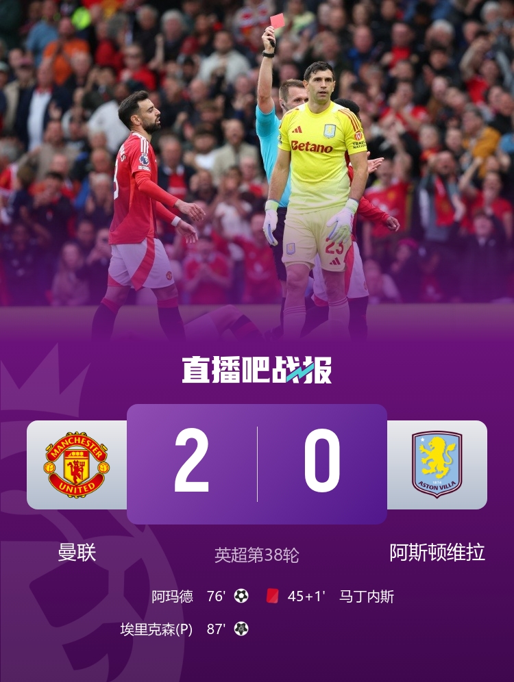 曼聯2-0擊敗十人維拉,大馬丁染紅,阿瑪德造兩球,曼聯以聯賽第15收官。