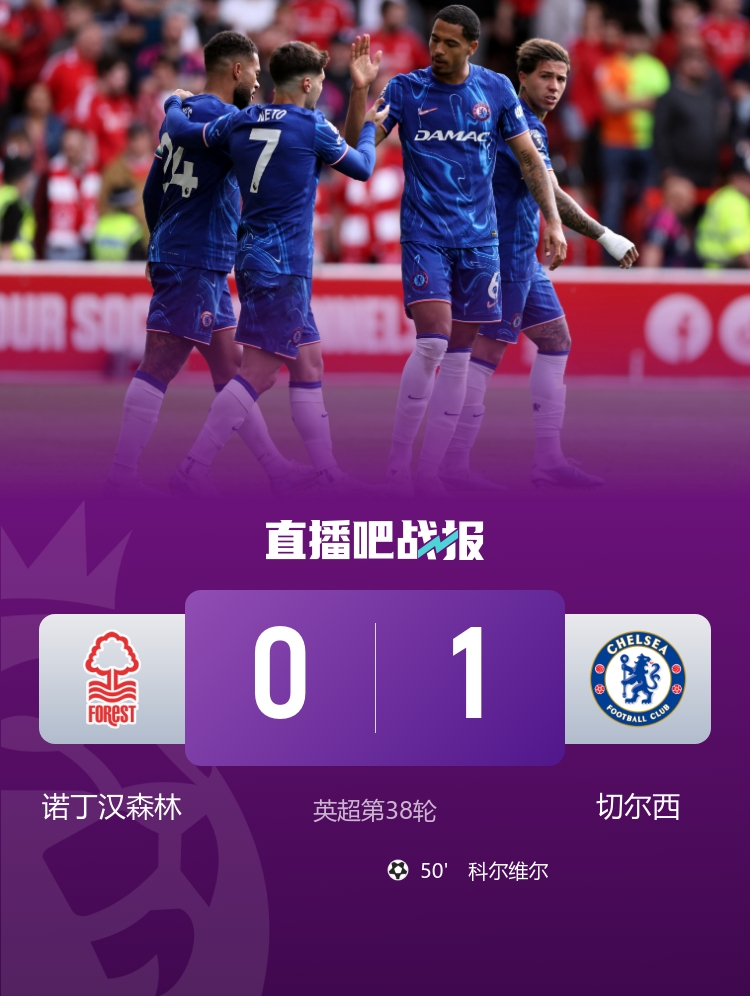 切爾西1-0擊敗森林,科爾維爾打入全場唯一進球。藍軍第4收官將戰歐冠,森林將出戰歐協聯。