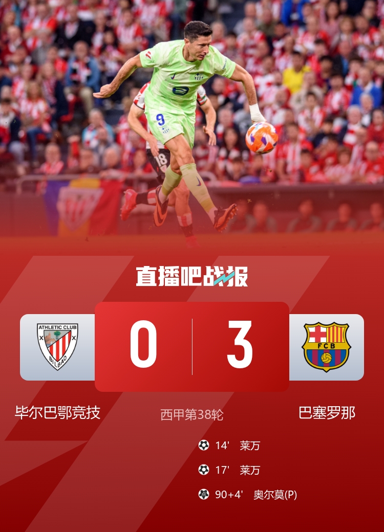 巴薩3-0擊敗畢巴,結束本賽季西甲征程,萊萬打入兩球,奧爾莫破門。