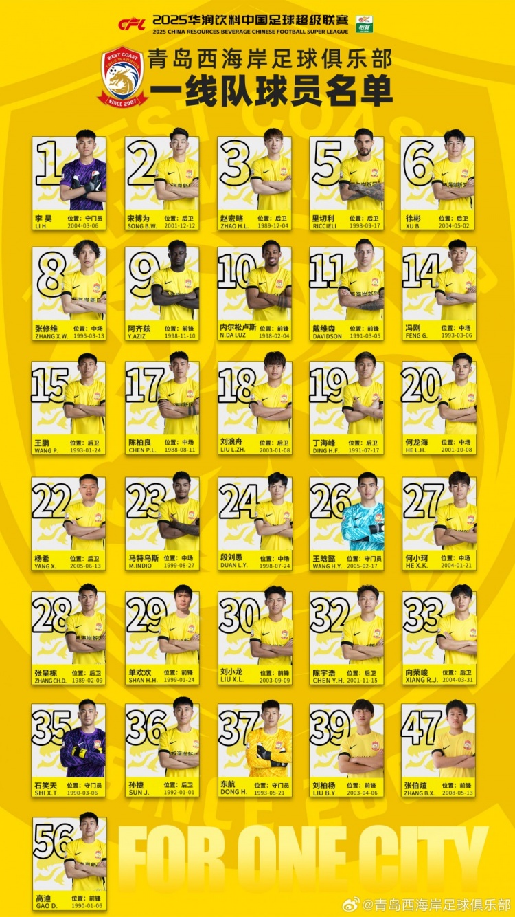 2月21日訊 今日,青島西海岸官媒公布了新賽季一線隊球員名單,具體如下:
