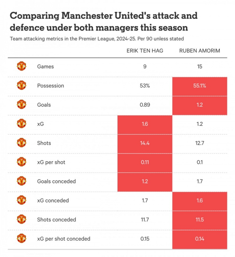 阿莫林加盟至今,曼聯在比賽中的關鍵指標是否發生了變化?