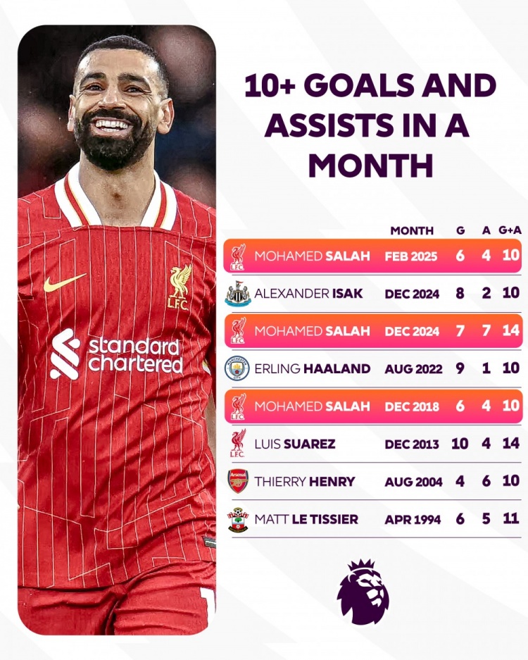2025-02-28 16:03:363次!薩拉赫是英超歷史唯一的多次單月聯賽制造進球上雙的球員