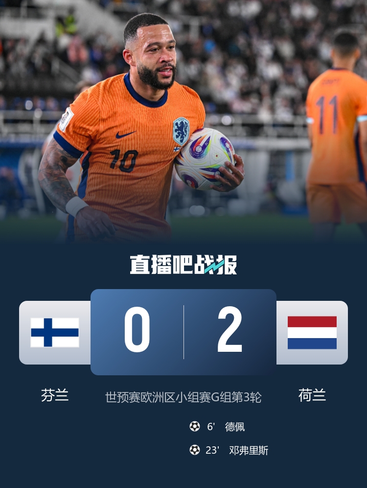 世預賽歐洲區(qū)小組賽G組第3輪,德佩、鄧弗里斯進球,荷蘭2-0戰(zhàn)勝芬蘭。