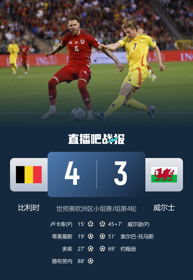 德布勞內(nèi)88分鐘絕殺,比利時(shí)有驚無險(xiǎn)4-3擊敗威爾士,取得世預(yù)賽首勝。