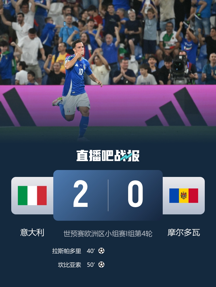拉斯帕多里、坎比亞索破門,意大利2-0擊敗摩爾多瓦,取得世預(yù)賽首勝,送別斯帕萊蒂!