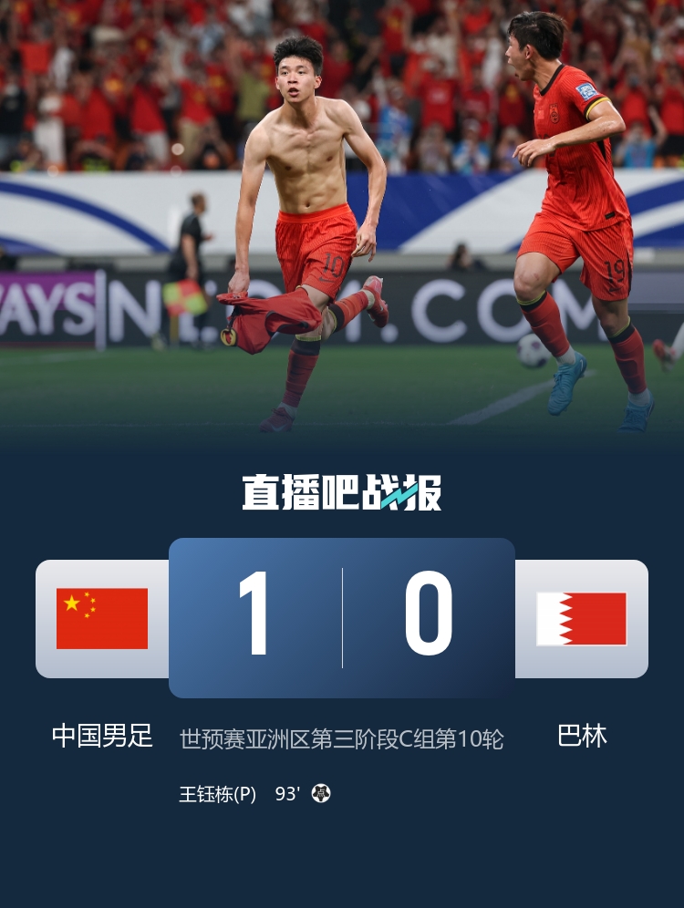 國足主場1-0絕殺+雙殺巴林贏下榮譽戰,王鈺棟處子球,國足終結世預賽4連敗,積9分位居小組倒數第二收官。