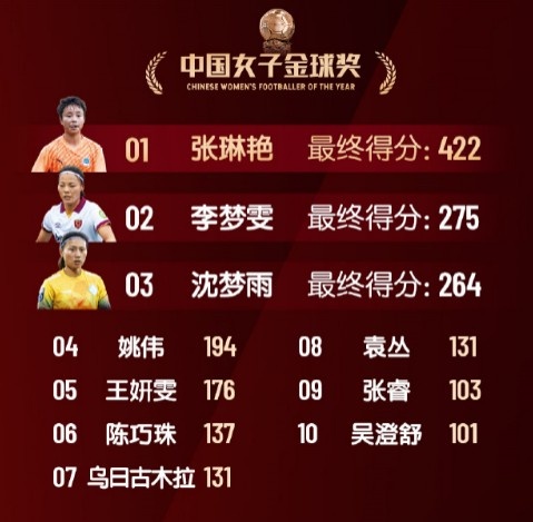 2月21日訊 《足球周刊》公布了本次中國金球獎各獎項評選具體得分,其中中國金帥獎方面于根偉斷層領先,中國女子金球獎則是張琳艷同樣較大優(yōu)勢領跑。