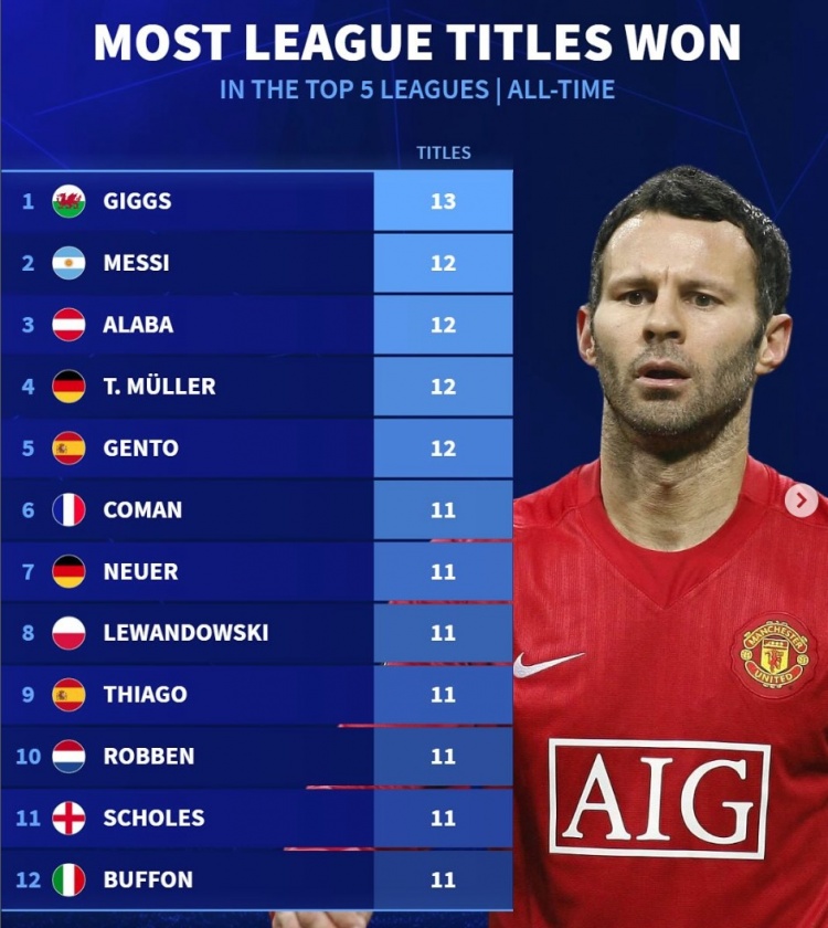 2025-03-01 08:08:06五大聯(lián)賽歷史奪冠榜:吉格斯13冠居首,梅西、阿拉巴、穆勒12冠
