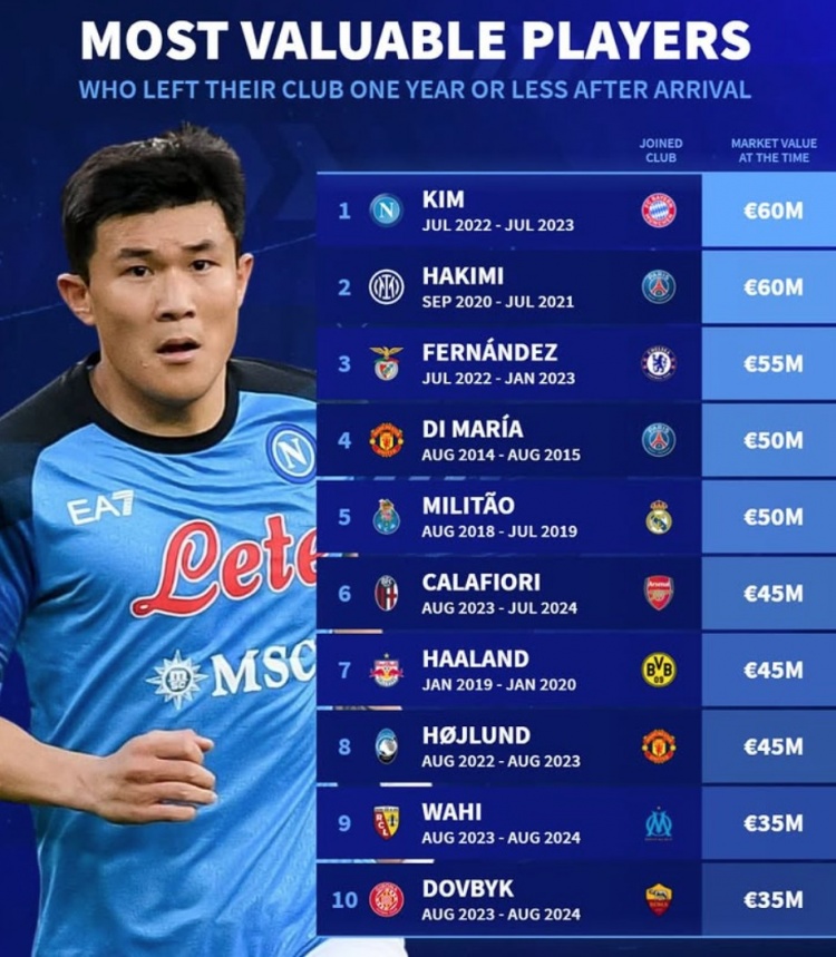 1.金玟哉(那不勒斯→拜仁),6000萬