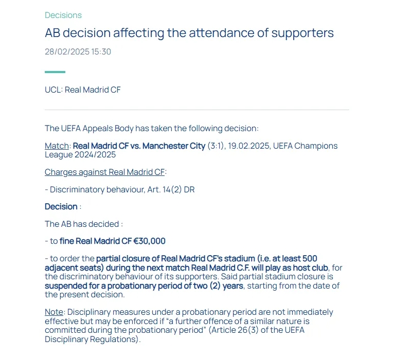 根據裁決書:“若皇馬球迷在未來兩年觀察期內再次出現類似違規行為,將立即執行部分看臺關閉措施。”該觀察期自2月28日裁決公布之日起計算。除看臺關閉警告外,歐足聯還同步開出了立即生效的3萬歐元罰單。