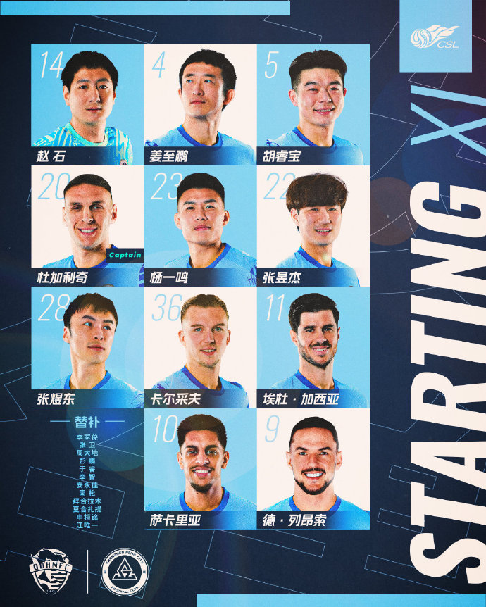 青島海牛替補:1-劉君、2-肖鯤、5-沙一博、8-林創益、10-馮伯元、12-陳純新、24-胡靖航、27-鄭龍、31-羅森文、33-劉佳燊、34-金永浩、37-韋所為