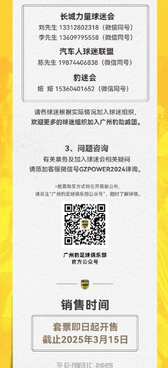 2025-03-01 16:01:32廣州豹新賽季主場票務公告:個人套票599元/賽季,散票最高100元