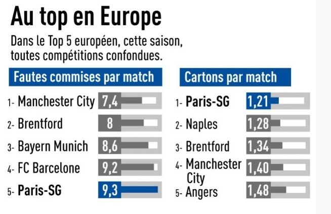 2025-03-01 16:01:43隊報統計:本賽季至今,巴黎場均犯規和吃牌數均排五大聯賽前五少