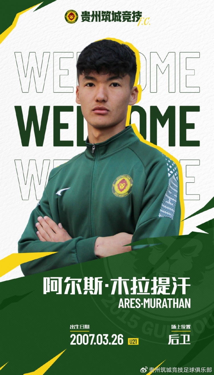 ??經與球員協商一致,阿爾斯-木拉提汗正式加盟貴州筑城競技足球俱樂部。阿爾斯-木拉提汗2007年3月26日出生于新疆烏魯木齊,身高192cm,體重80kg,司職中后衛。