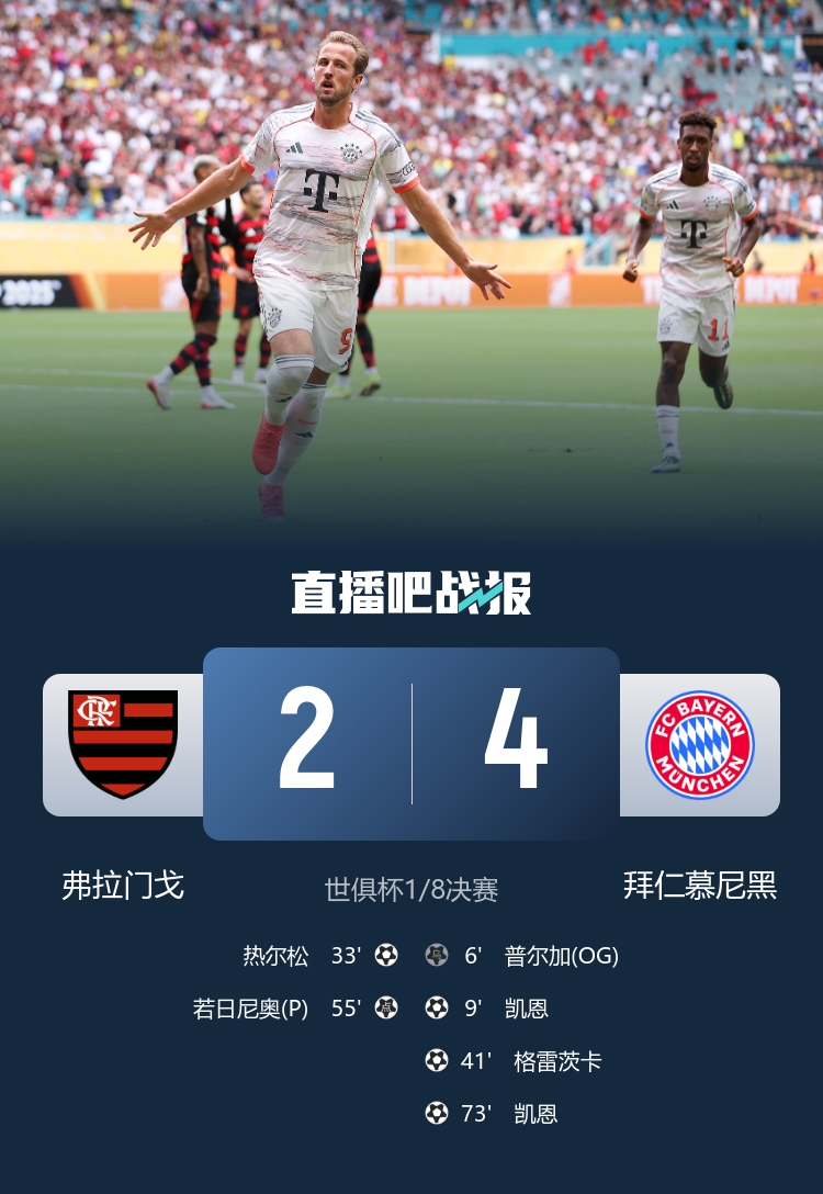 世俱杯1/8決賽,拜仁慕尼黑4-2弗拉門戈,凱恩梅開二度,格雷茨卡世界波。