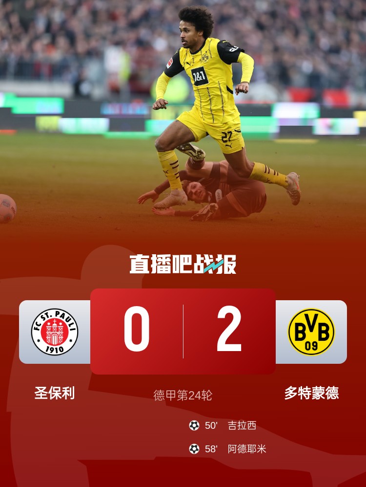 多特本輪2-0擊敗圣保利,吉拉西、阿德耶米的進球為多特拿下3分。