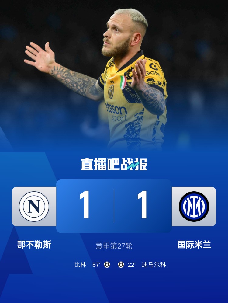 意甲本輪焦點大戰,那不勒斯主場1-1戰平國米,雙方進球者為比林和迪馬爾科,國米方面迪馬爾科和恰20均傷退。