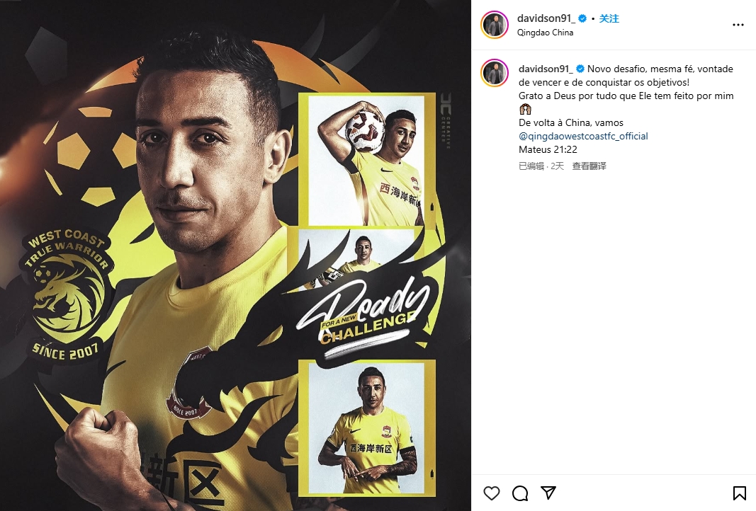2025-02-21 17:37:36戴維森社媒發文談重返中超,陶強龍留言:NB