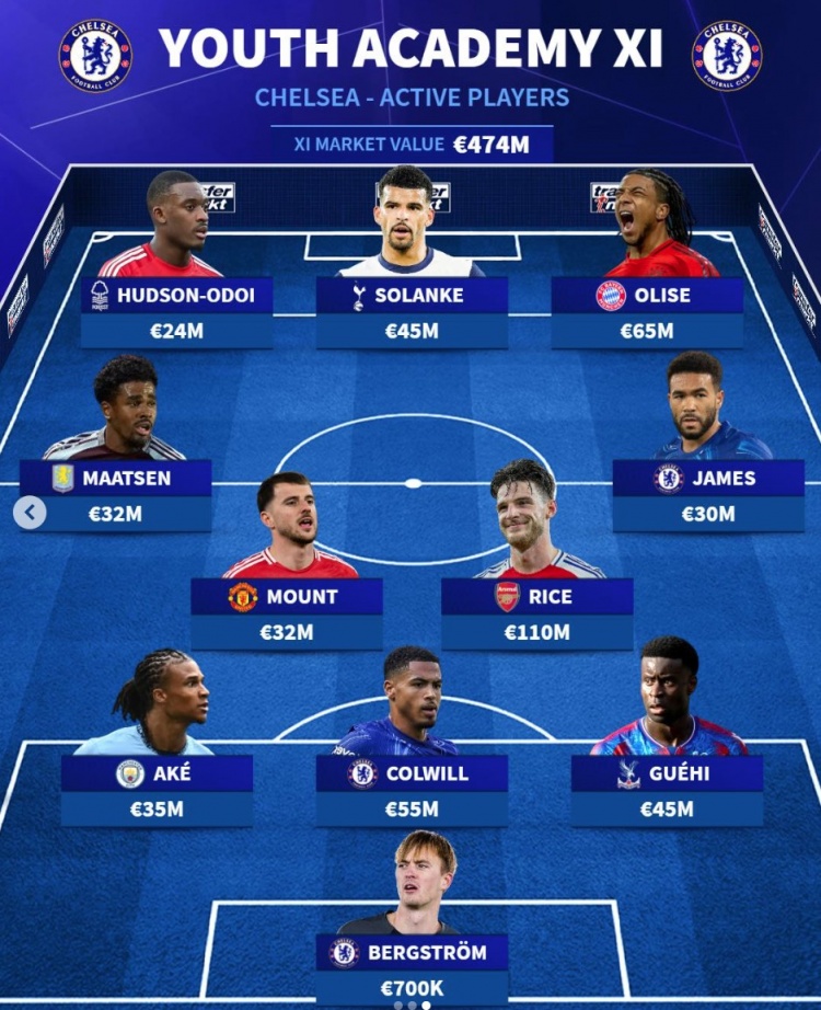 切爾西青訓當前身價最貴陣:總身價4.74億歐元