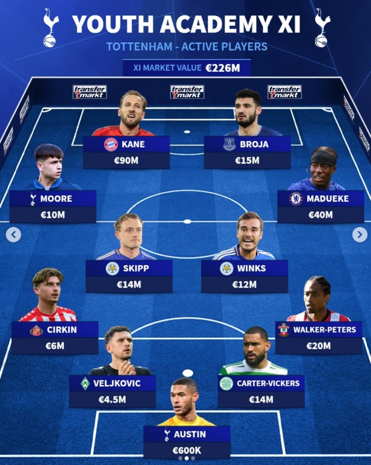 3月2日訊 《轉會市場》統計了阿森納、熱刺和切爾西三隊青訓出品的當前球員身價最貴陣,凱恩、薩卡、賴斯領銜。