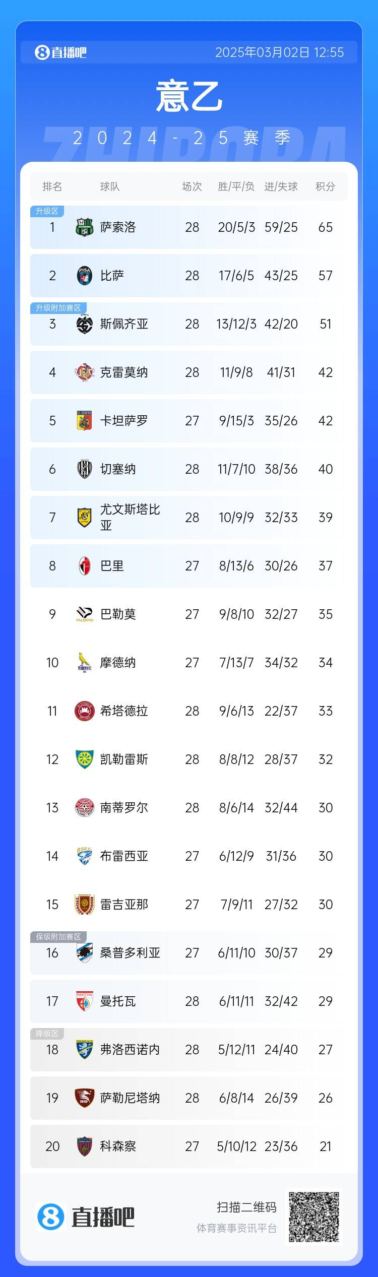 2025-03-02 17:42:56顫抖吧國(guó)米!薩索洛5輪4勝14分領(lǐng)跑意乙直通區(qū),去年雙殺意甲冠軍