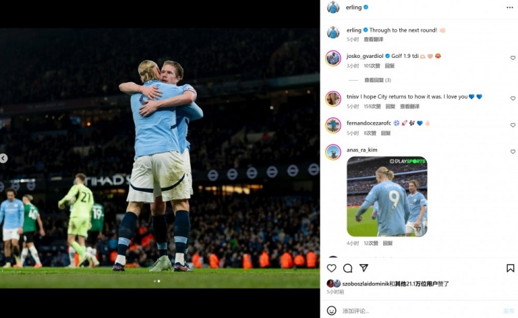 2025-03-02 17:45:19布丁連線再現,哈蘭德社媒曬與德布勞內擁抱合影:晉級下一輪!