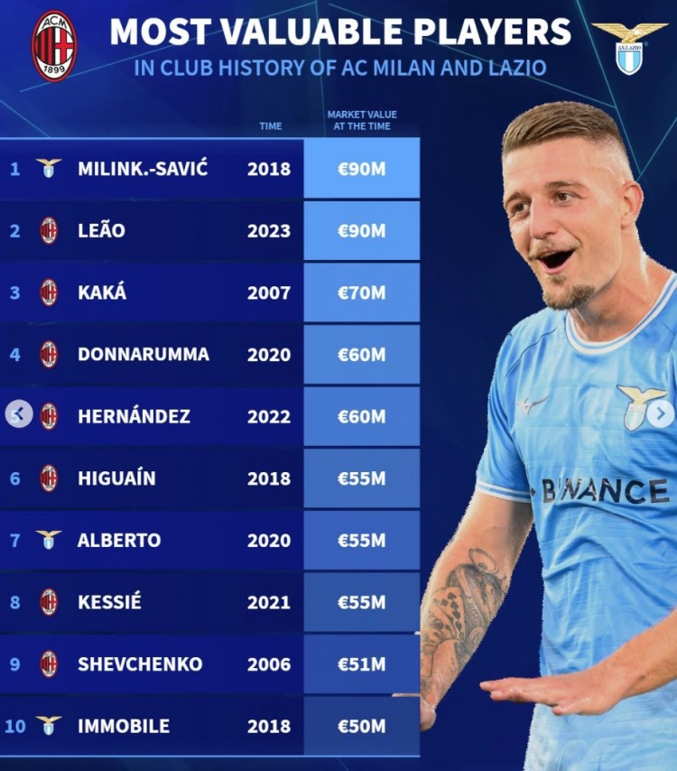 2025-03-03 02:49:39米蘭&拉齊奧歷史德轉身價最貴榜:米林&萊奧9千萬 卡卡07年7千萬