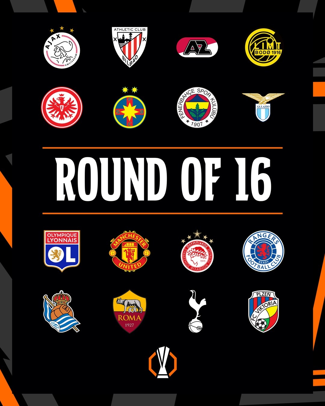 歐聯(lián)16強(qiáng):拉齊奧、畢巴、曼聯(lián)、熱刺、法蘭克福、里昂、奧林匹亞科斯、流浪者、阿爾克馬爾、羅馬、布加勒斯特星、博德閃耀、比爾森勝利、皇家社會(huì)、費(fèi)內(nèi)巴切、阿賈克斯