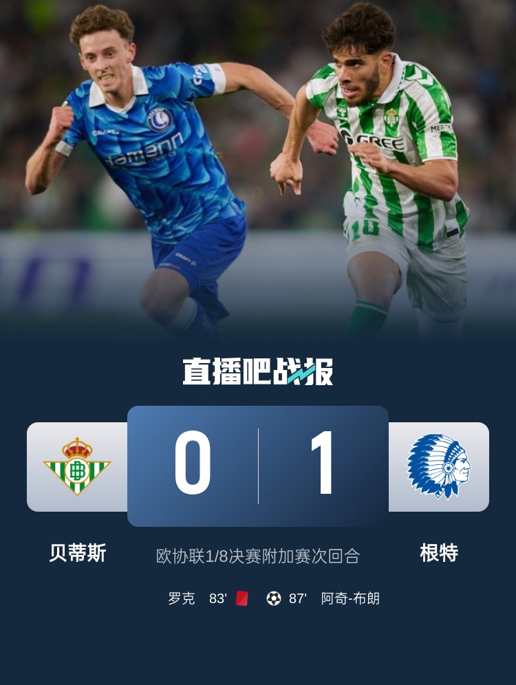 歐協(xié)聯(lián)賽場(chǎng),貝蒂斯0-1總比分3-1根特進(jìn)16強(qiáng),安東尼出戰(zhàn)59分鐘,羅克染紅。