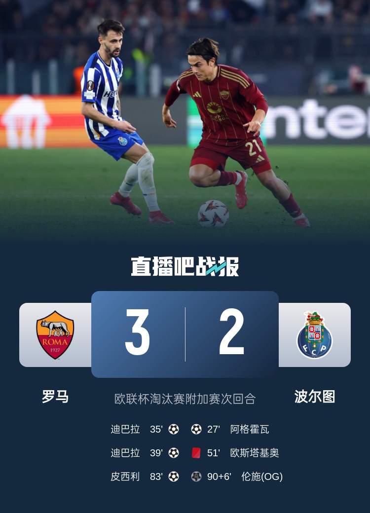 歐聯(lián)杯淘汰賽附加賽次回合,迪巴拉雙響,羅馬主場(chǎng)3-2逆轉(zhuǎn)波爾圖,總比分羅馬4-3淘汰十人波爾圖晉級(jí)歐聯(lián)杯16強(qiáng)。