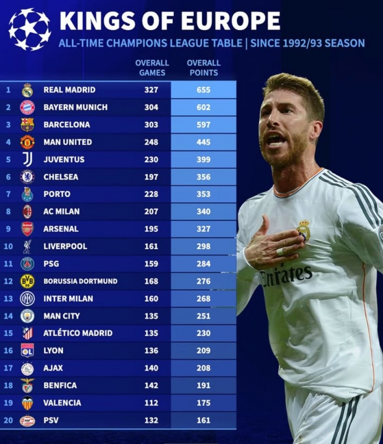 2月21日訊 歐冠淘汰賽附加賽已經結束,《轉會市場》也統計了92-93賽季改制后的歐冠歷史積分榜,皇馬無懸念領跑。