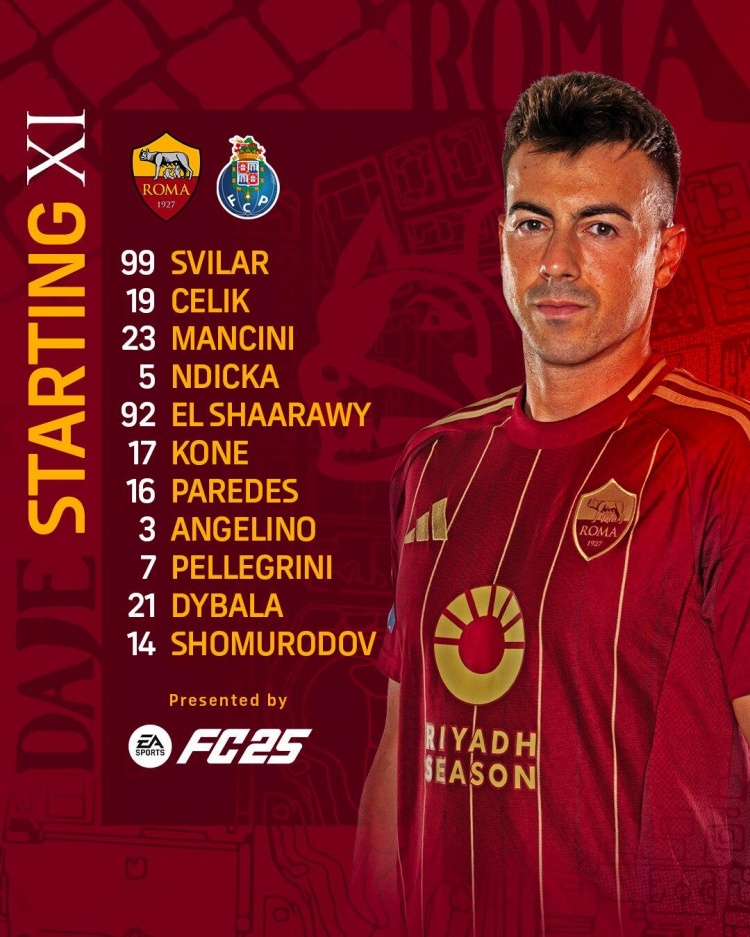 羅馬首發:99-斯維拉爾、5-恩迪卡、23-詹盧卡-曼奇尼、19-切利克、3-安吉利諾、16-帕雷德斯、17-科內、92-沙拉維、7-佩萊格里尼、21-迪巴拉、14-肖穆羅多夫
